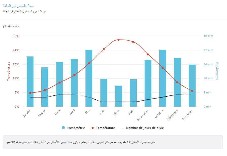 تتمتع ولاية الجلفة بمناخ شبه جاف يتسم ببرودة شتاء قارس وصيف حار وجاف.