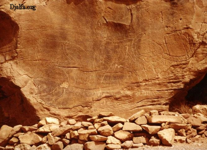 منطقة الجلفة غنية جدًا بالمواقع التي تعود إلى عصور ما قبل التاريخ ، فهي تتمتع بثراء أثري حقيقي ، ونقوش صخرية ولوحات فنية يعود تاريخها إلى ما يقرب من 1000 عام من 7500 إلى 10000 عام ، تمثل حيوانات مختلفة: الظباء ووحيد القرن والنعام.